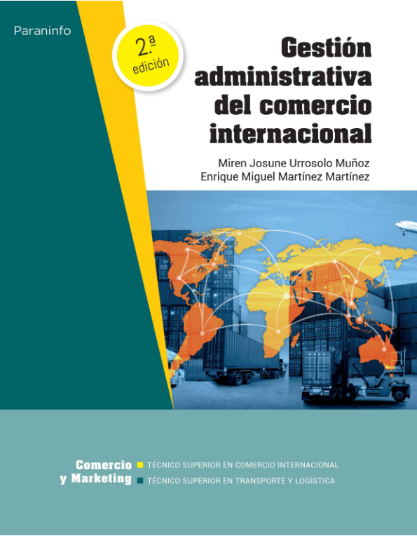 La importancia del comercio internacional;exige una sólida formación de los profesionales;de hoy y de mañana: la clave para conseguirlo;es estar en continua actualización.;El libro desarrolla los contenidos del módulo profesional de Gestión Administrativa del Comercio Internacional, de los Ciclos Formativos de grado superior en Comercio Internacional y en Transporte y Logística, pertenecientes a la familia profesional de Comercio y Marketing.;En esta nueva edición de Gestión administrativa del comercio internacional se ha realizado;— una revisión de los contenidos básicos exigidos en este módulo para adecuarlos a los currículos de los Ciclos Formativos a los que se dirige.;— una actualización de la materia conforme a la normativa vigente.;— una mejor organización en el orden de las unidades, teniendo en cuenta tanto el aprendizaje progresivo como la secuenciación de las evaluaciones.;— la ampliación del contenido con una unidad íntegra sobre el perfil de representante aduanero, salida profesional para aquellos estudiantes que se hayan quedado «atrapados» por la materia.;En este manual se explican los contenidos básicos del comercio internacional, pasando por los trámites aduaneros hasta llegar a los impuestos indirectos aplicados en el país de destino. Se incluyen, además, dos unidades globales dedicadas a los expedientes completos de exportación y de importación, que otorgan al libro una visión unitaria y global.;El enfoque del libro responde a las necesidades de la FP Dual y su elaboración ha sido posible gracias a la integración de sus tres pilares básicos: el profesorado, el alumnado y la empresa.;Los contenidos teóricos se acompañan de imágenes, tablas, documentos reales, cuadros de vocabulario e información importante o adicional, enlaces web, referencias a documentación y normativa específicas, mapas conceptuales y actividades propuestas, de comprobación de tipo test, de aplicación y de ampliación.;A simismo, la obra ofrece útiles recursos digitales para el alumnado, a los que podrá acceder desde la pestaña de «Recursos previo registro» de la ficha web de la obra, en www.paraninfo.es.;Miren Josune Urrosolo Muñoz es titulada en Ciencias Empresariales y cuenta con una amplia experiencia docente en el campo de la Formación Profesional, tanto reglada como no reglada.;Enrique Miguel Martínez Martínez es titulado en FP Dual de Transporte y Logística y, actualmente, Representante Aduanero.