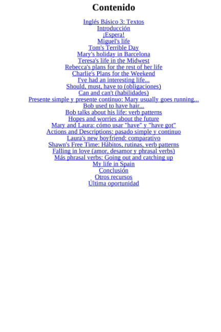 Textos que utilizan los tiempos verbales más importantes: presente simple, presente continuo, presente perfecto, pasado simple etc, además de estructuras gramaticales como el comparativo, los phrasal verbs, los verbos modales y mucho más… Y todo adaptado para gente de nivel básico.